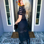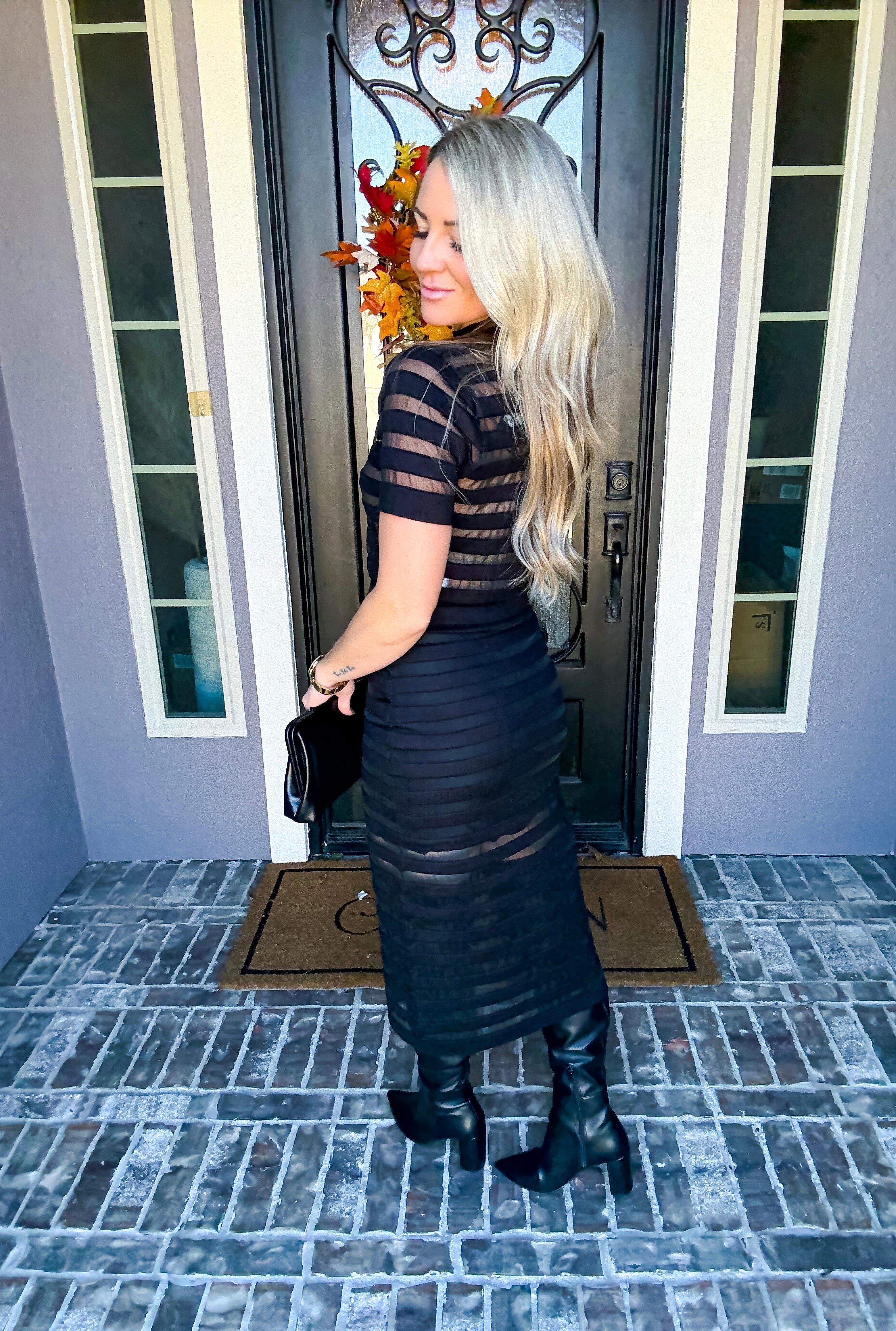 Perfect for any occasion, this skirt will surely become a staple in your wardrobe. Made with stretchy fabric, this high-rise skirt boasts a chic and stylish design. The lining above the knee ensures comfort, while the see-through detail below the knee adds a touch of elegance.