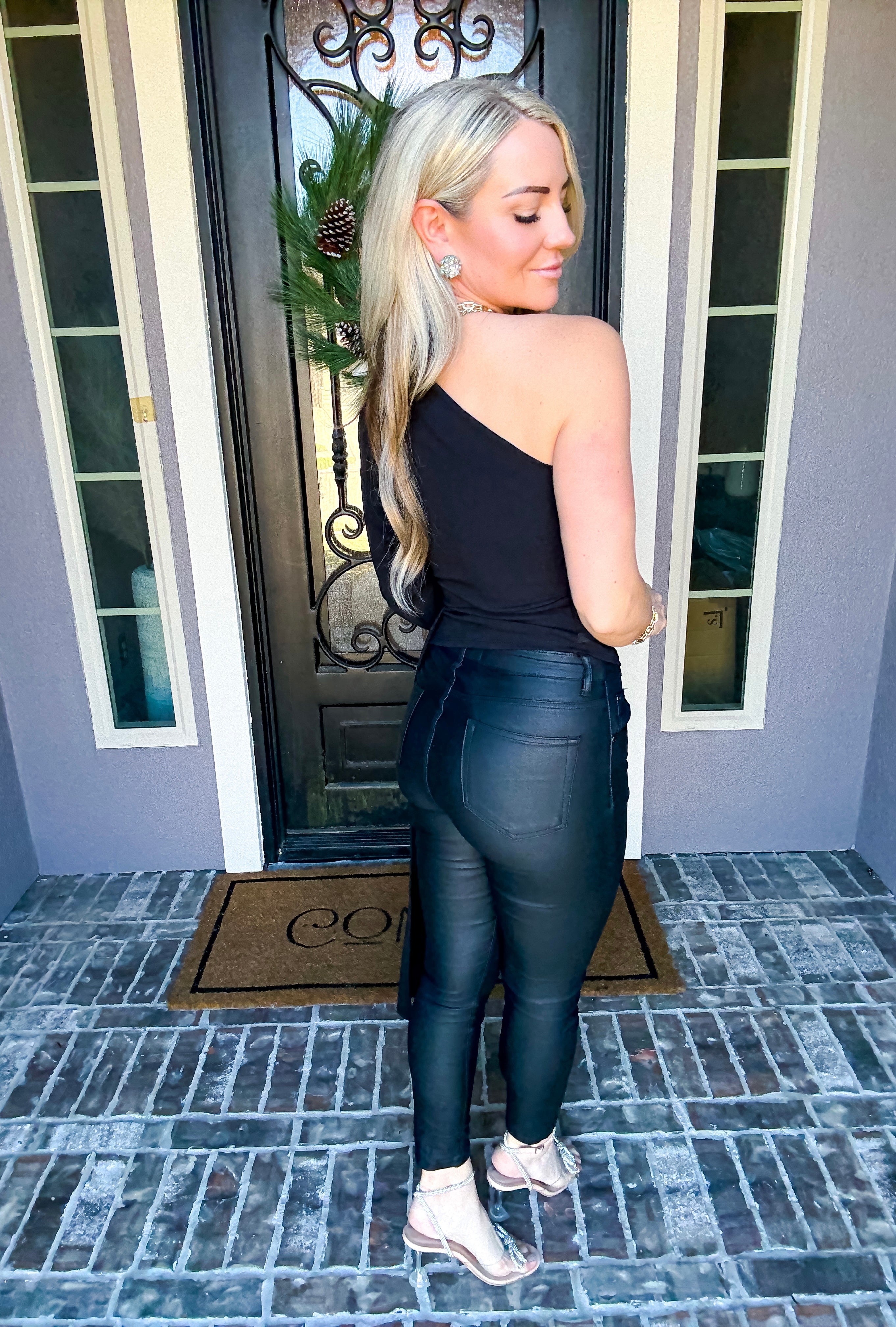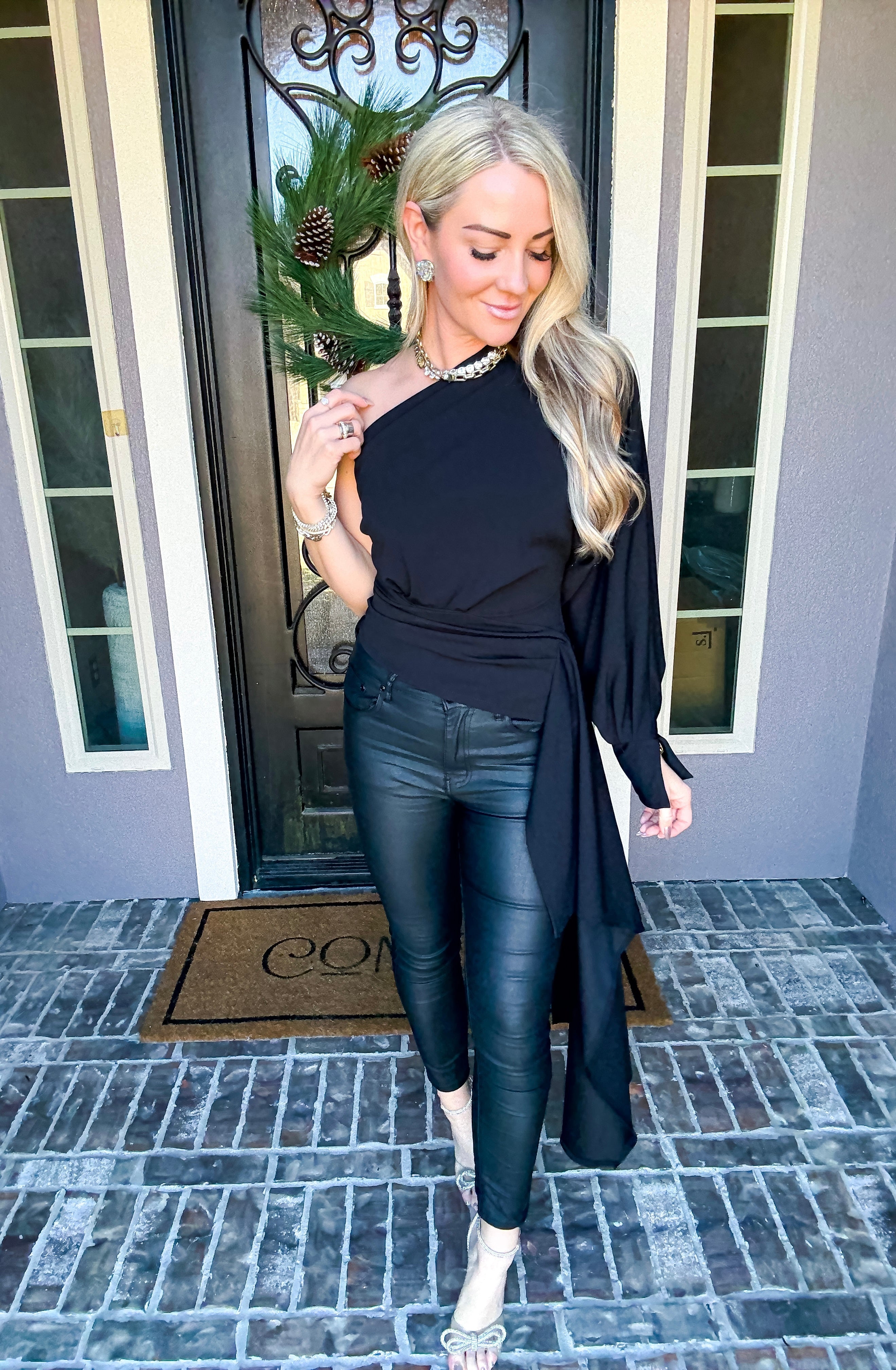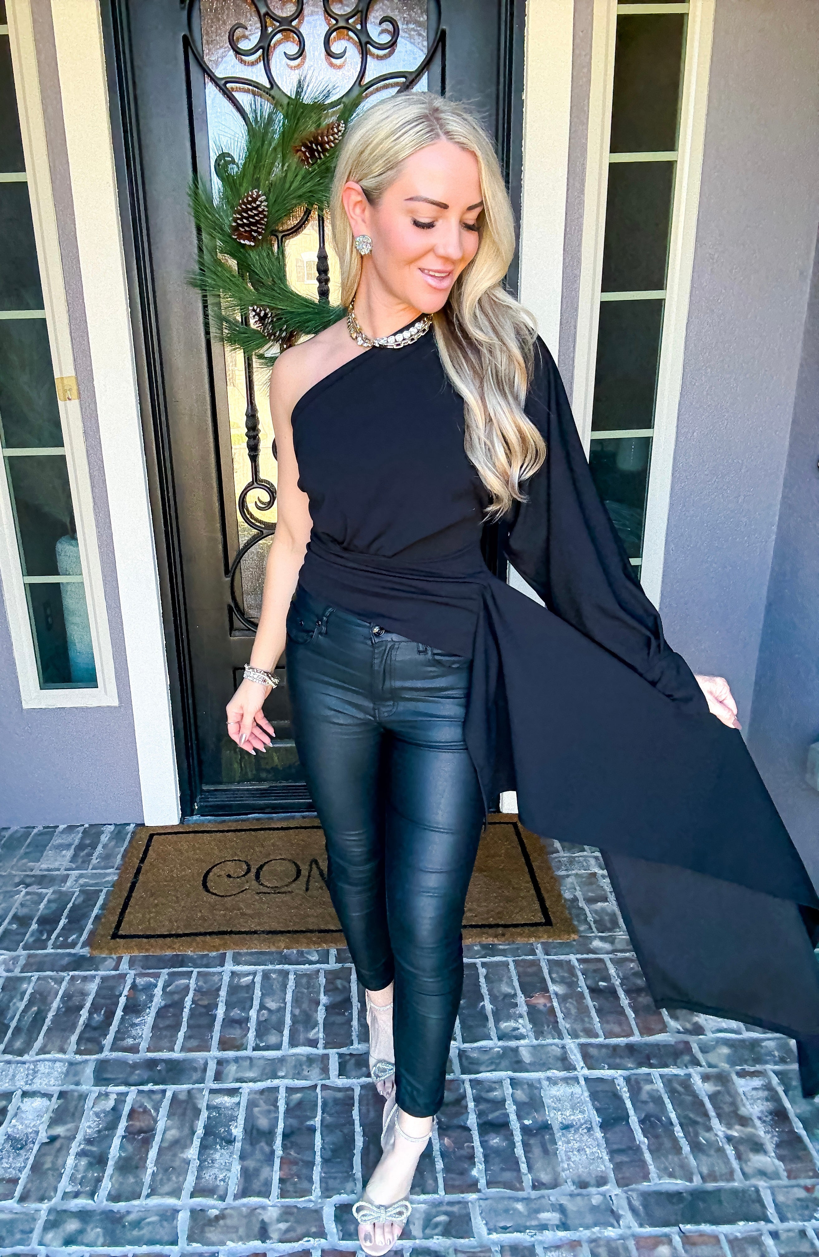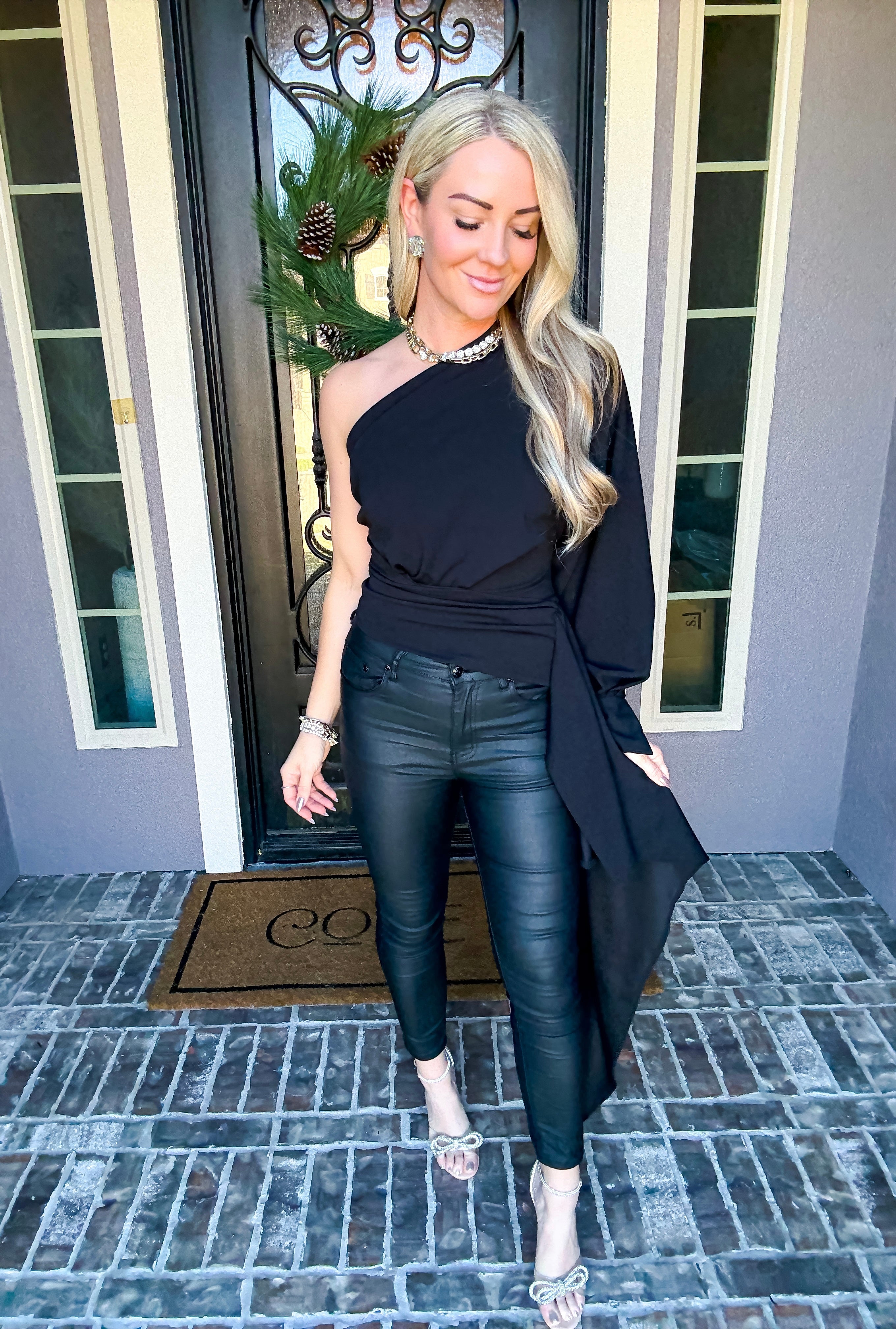 The Nightfall Muse One Shoulder Top combines contemporary elegance with versatile styling. This striking piece features an asymmetrical one-shoulder silhouette paired with a dramatic train detail on one side, creating an eye-catching focal point. The design transitions seamlessly from evening occasions to elevated casual wear, making it a versatile addition to any wardrobe. Whether styled for a formal event or dressed down with everyday pieces, this top delivers sophisticated impact with its modern cut and refined proportions.