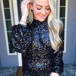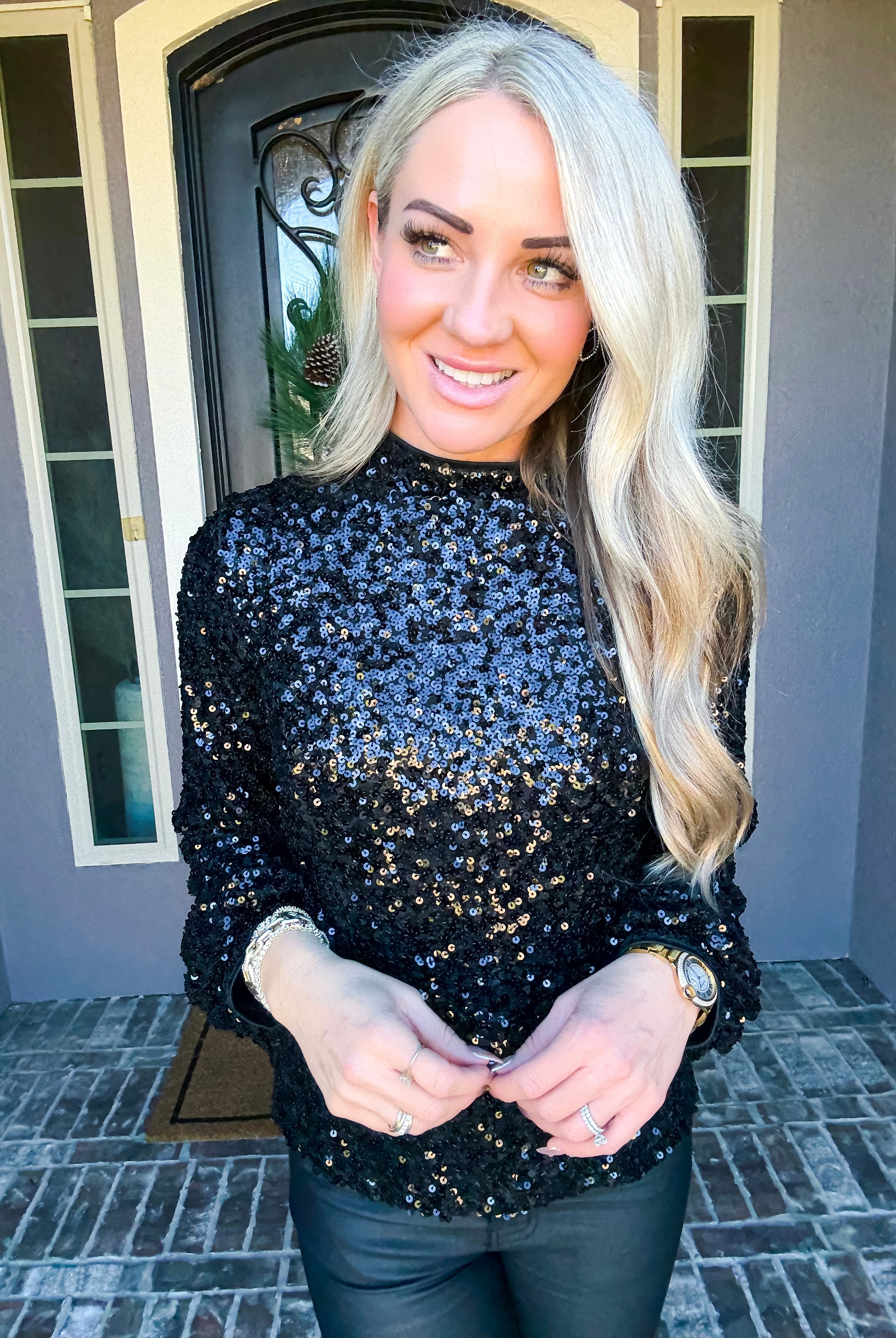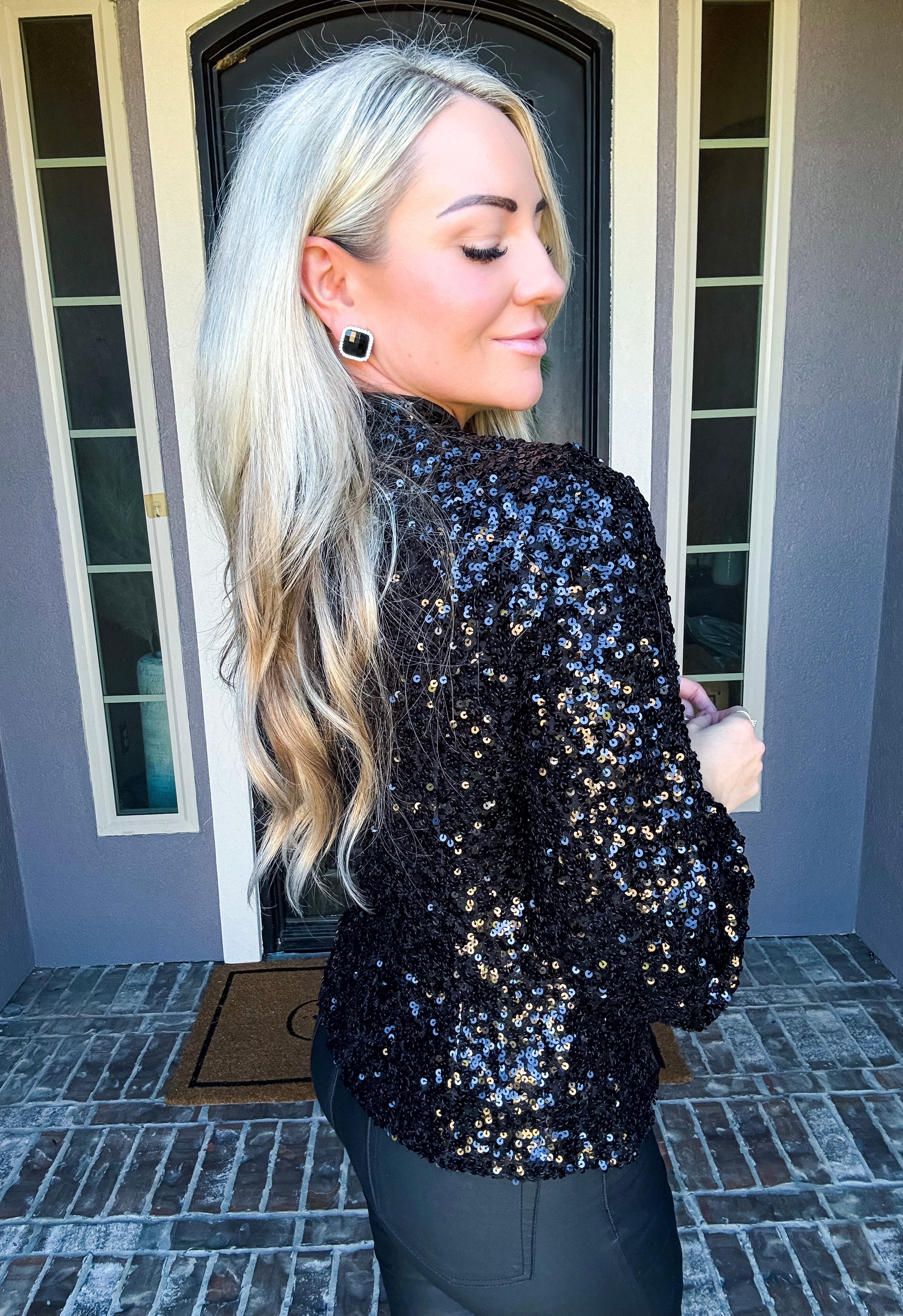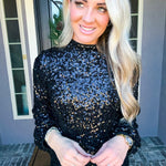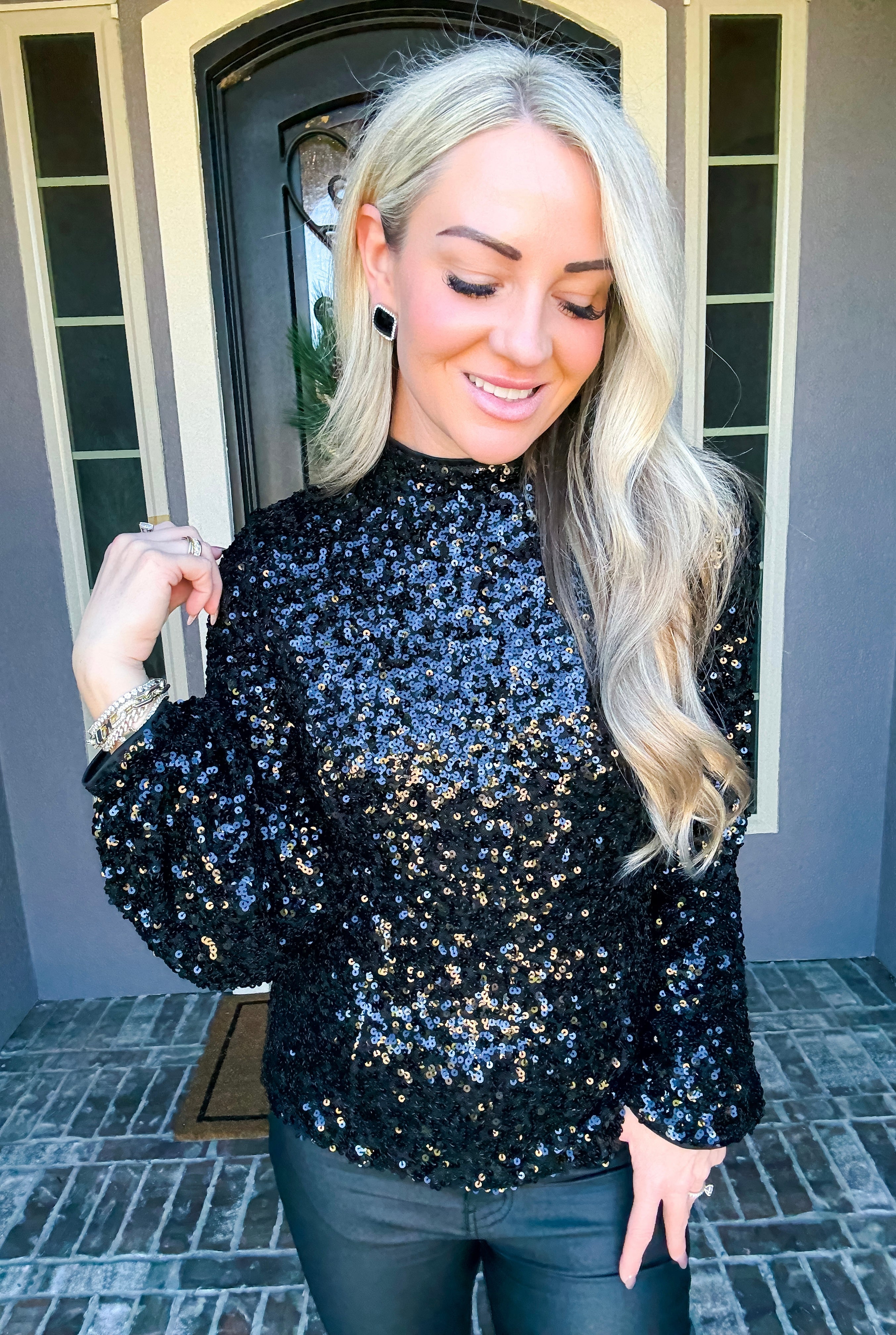 Make a statement this season with the NYE Muse Sequin Top, designed for those who embrace bold elegance. Crafted from shimmering black sequins, this piece features a sophisticated high neckline and a fitted bodice that flatters your silhouette. The signature balloon blousy sleeves add movement and drama, creating an effortlessly chic contrast. Perfect for holiday celebrations, evening events, or whenever you want to turn heads with understated glamour.