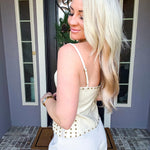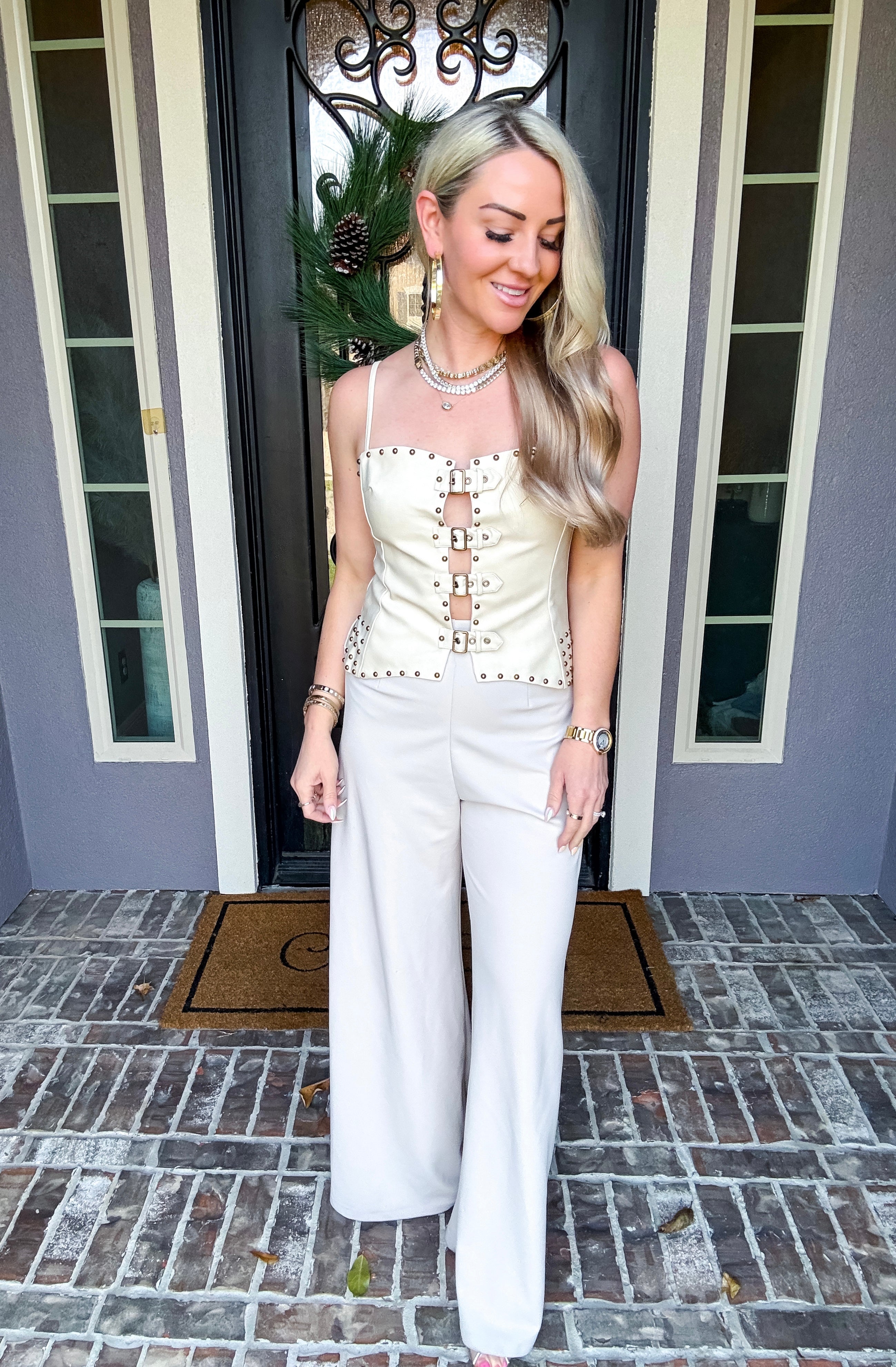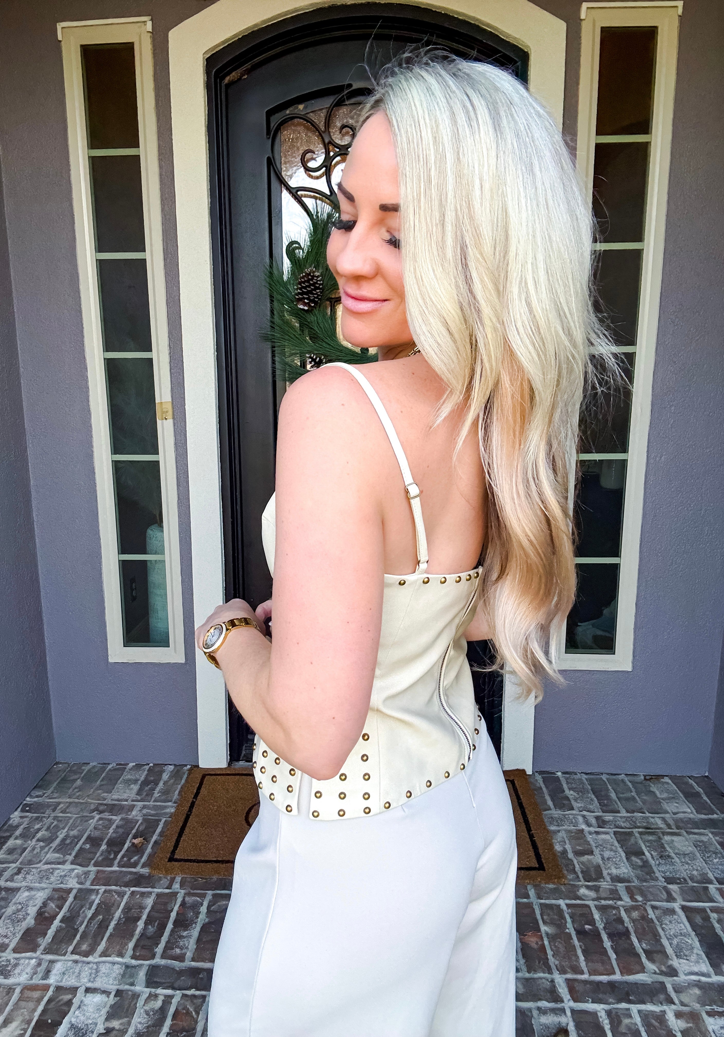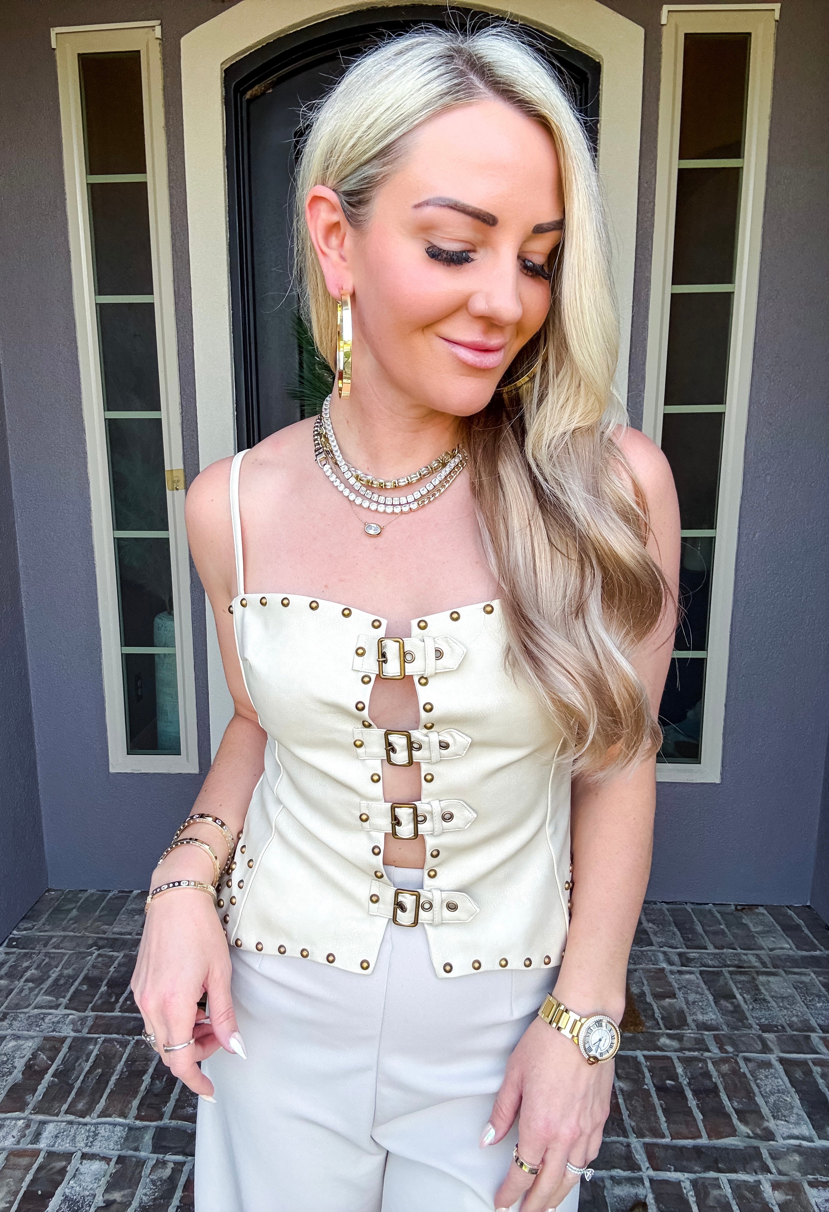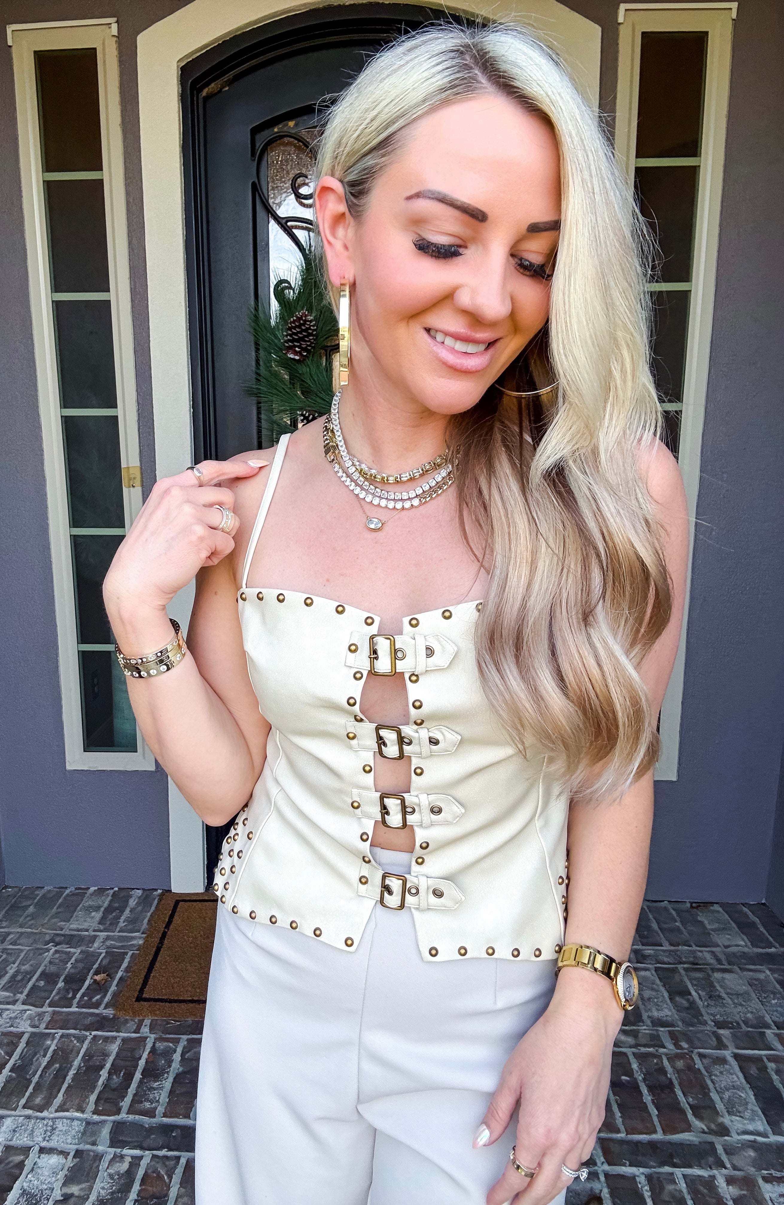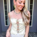 Elevate your wardrobe with the Portofino Leather Top, a striking faux leather piece designed for bold style. This edgy top features adjustable straps for a custom fit, decorative studs throughout for eye-catching detail, and a functional back zip for easy wear. Front belt options let you cinch and shape the silhouette to your preference. Perfect for making a statement at any occasion.