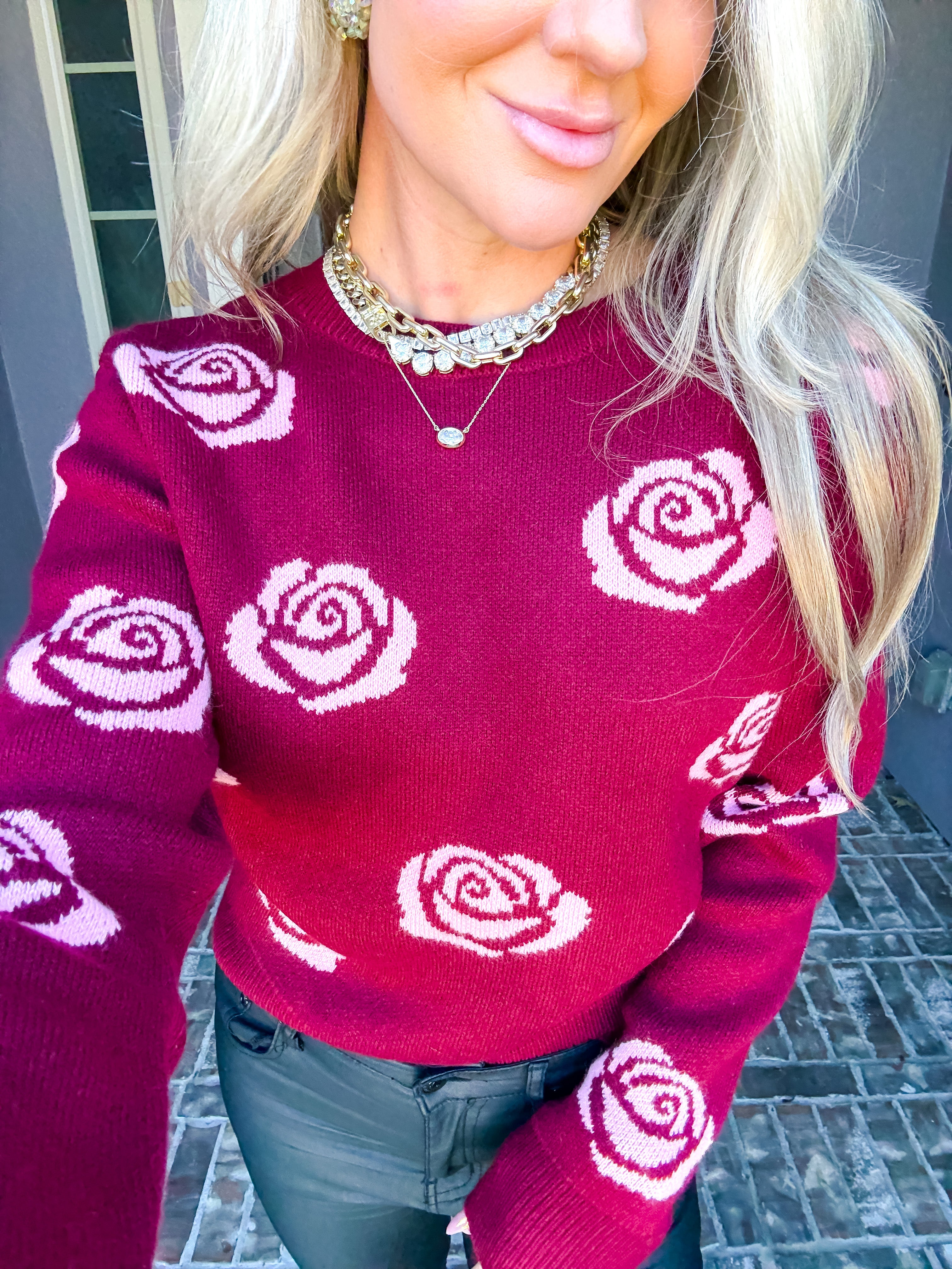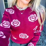 Rosy Embrace Sweater features an alluring design with delicate pink roses scattered across a rich red base, creating a piece that transitions effortlessly from casual to polished occasions. The exceptionally soft fabric drapes beautifully, offering comfort without compromise. Style it with jeans for relaxed elegance or layer over a dress for refined sophistication. A versatile essential that brings warmth and romantic charm to any wardrobe.