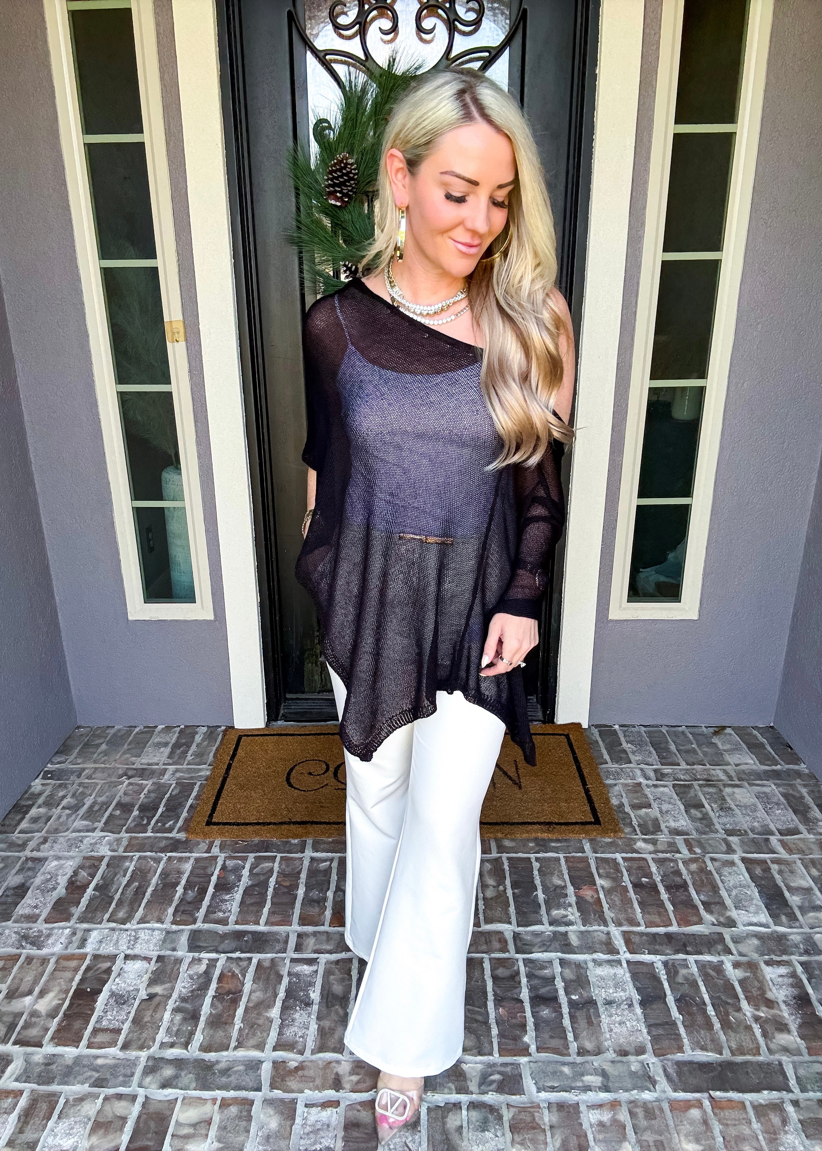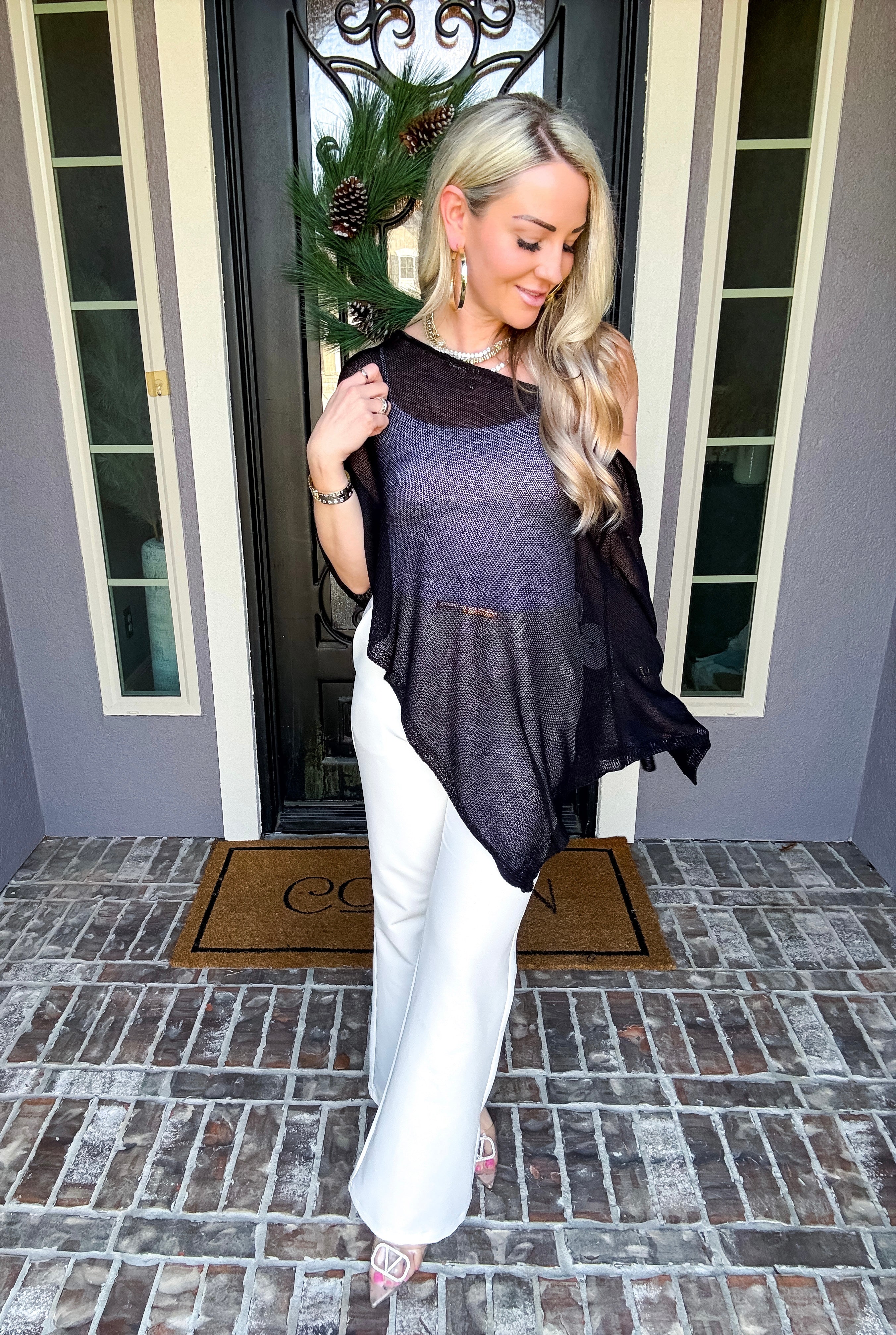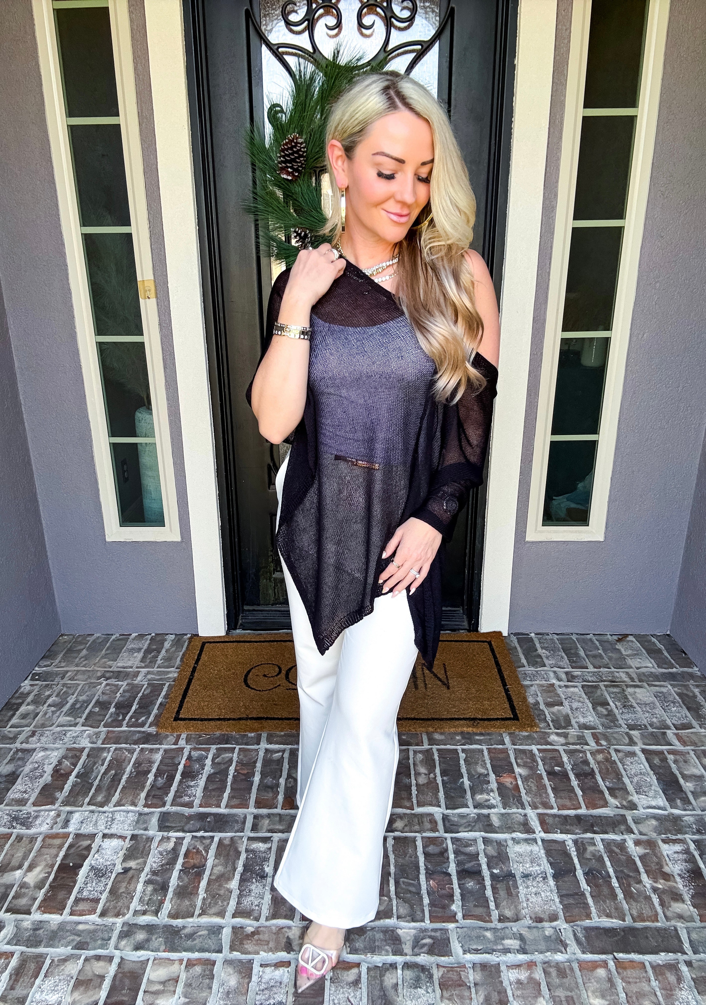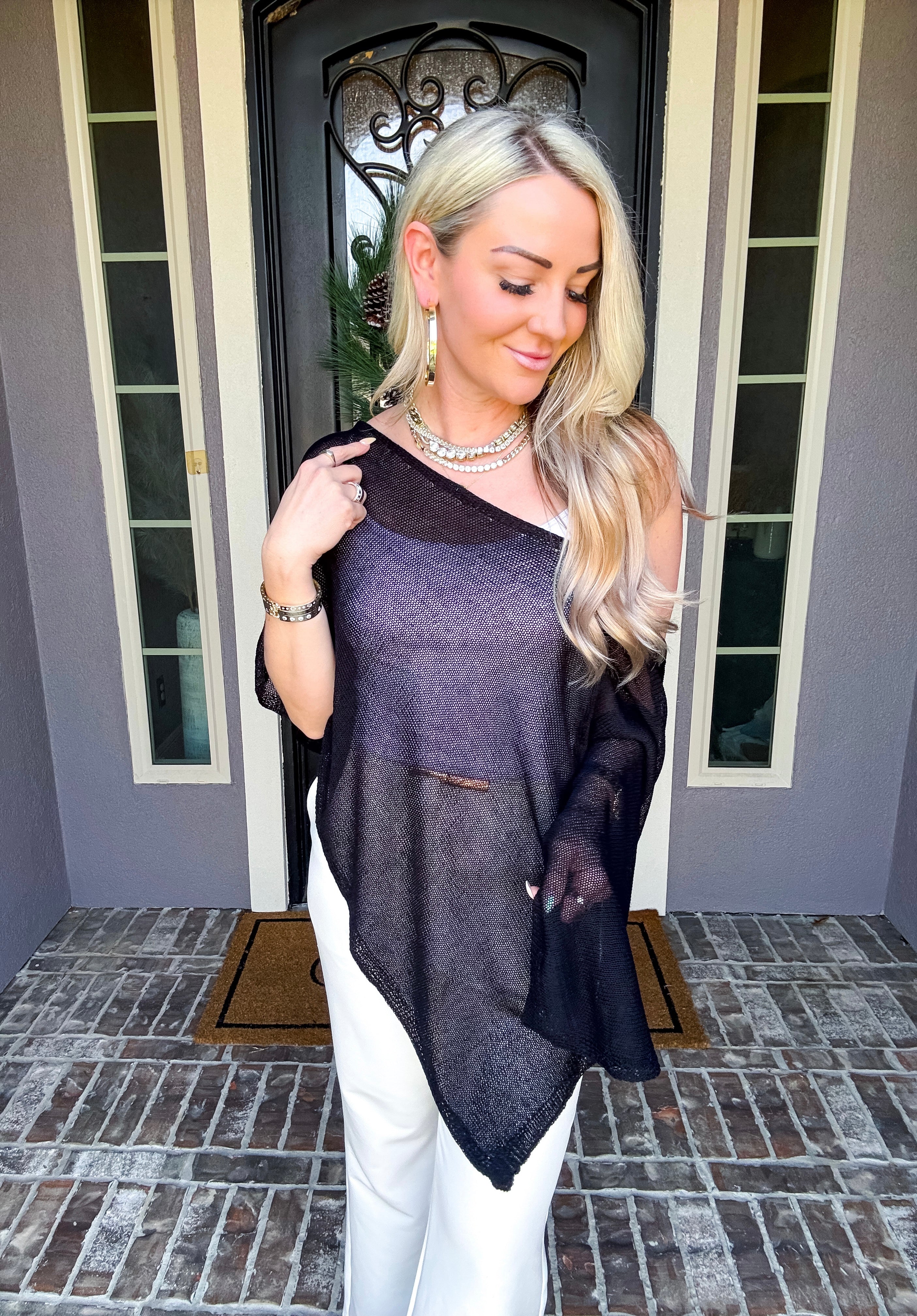 Elevate your wardrobe with this sophisticated off-shoulder shawl, designed to drape beautifully over any top. Its elegant silhouette adds a touch of class to casual and formal looks alike, making it the perfect layering piece for year-round styling. Versatile, timeless, and effortlessly chic.