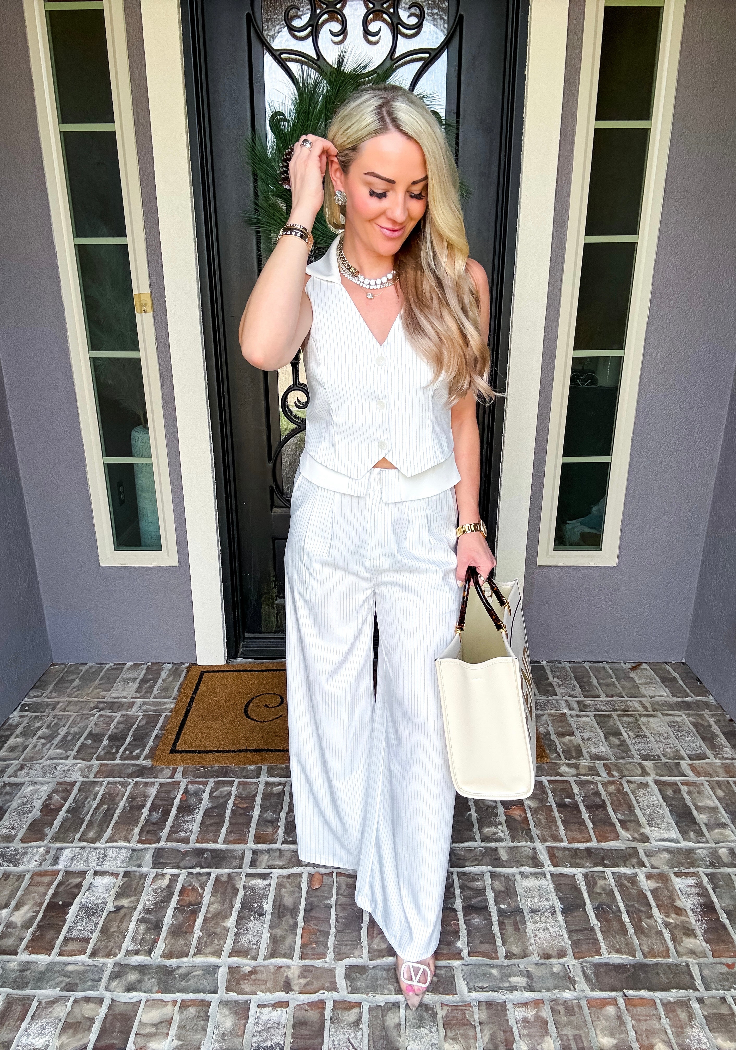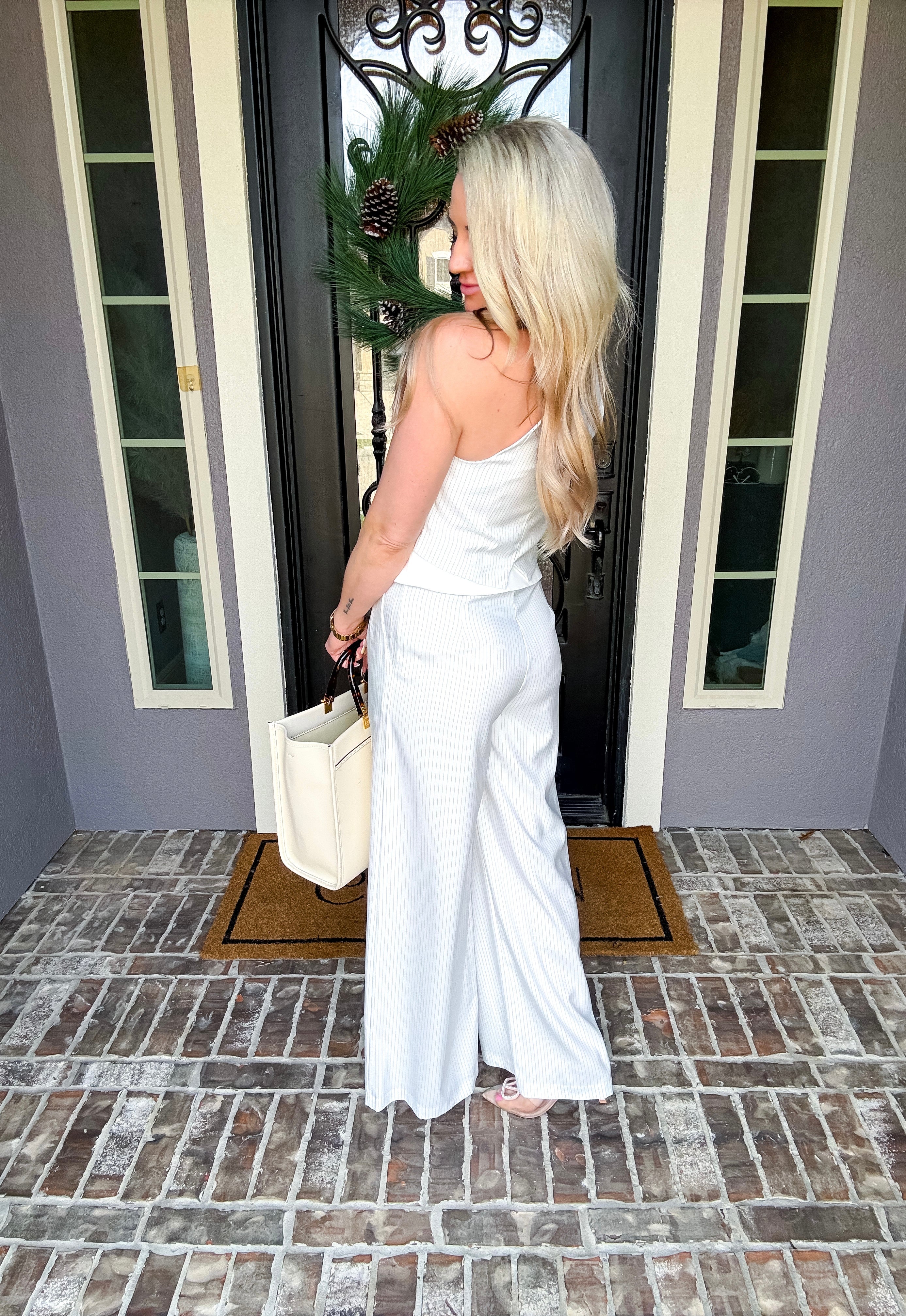 These Pinstripe Foldover Trousers combine classic tailoring with modern design. Featuring a distinctive foldover detail at the waistband, they add a stylish and intriguing touch to your outfit. The wide-leg cut offers a flattering silhouette and comfortable fit, making them ideal for both professional settings and elegant occasions. Crafted to elevate your wardrobe with subtle sophistication and ease.