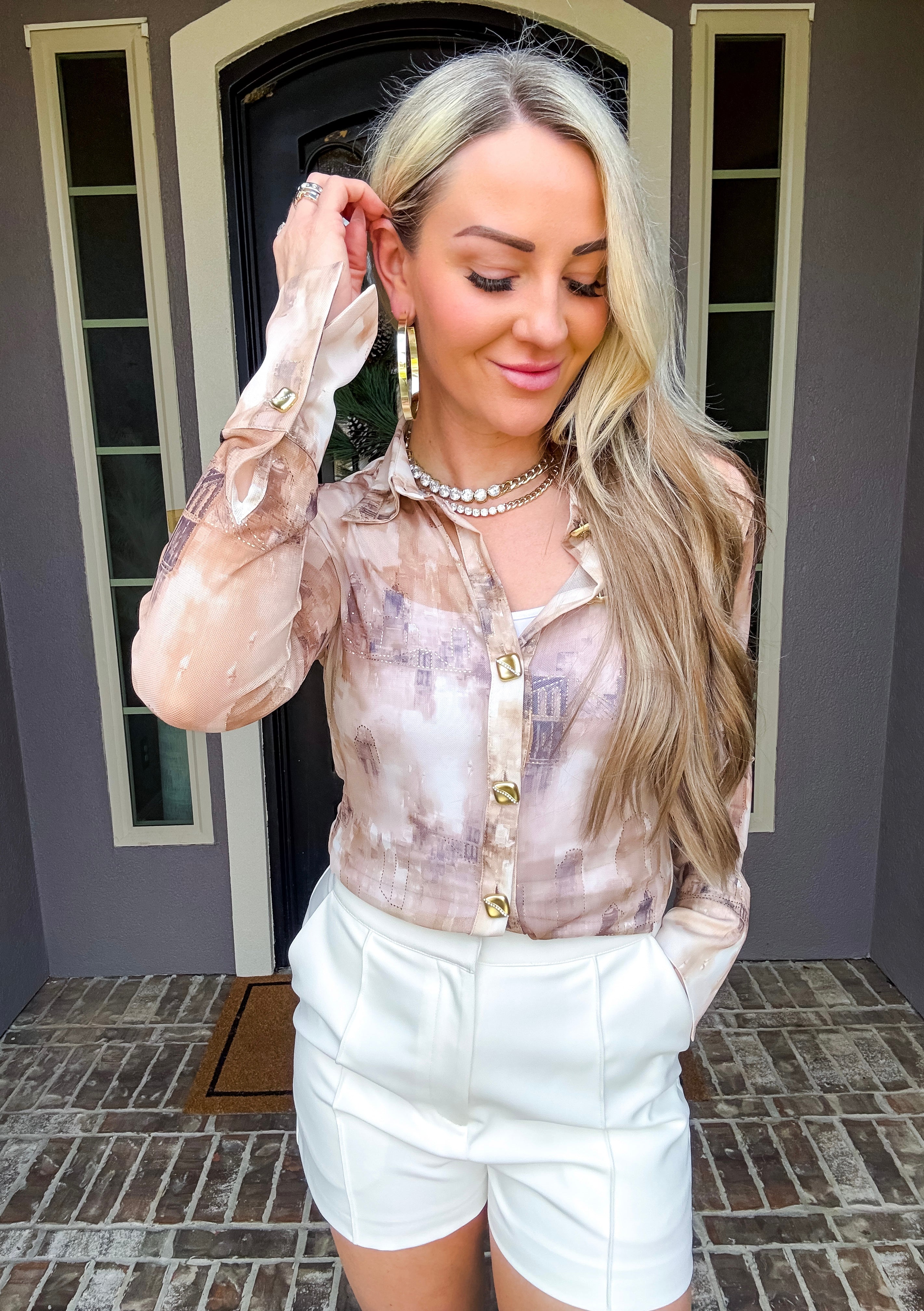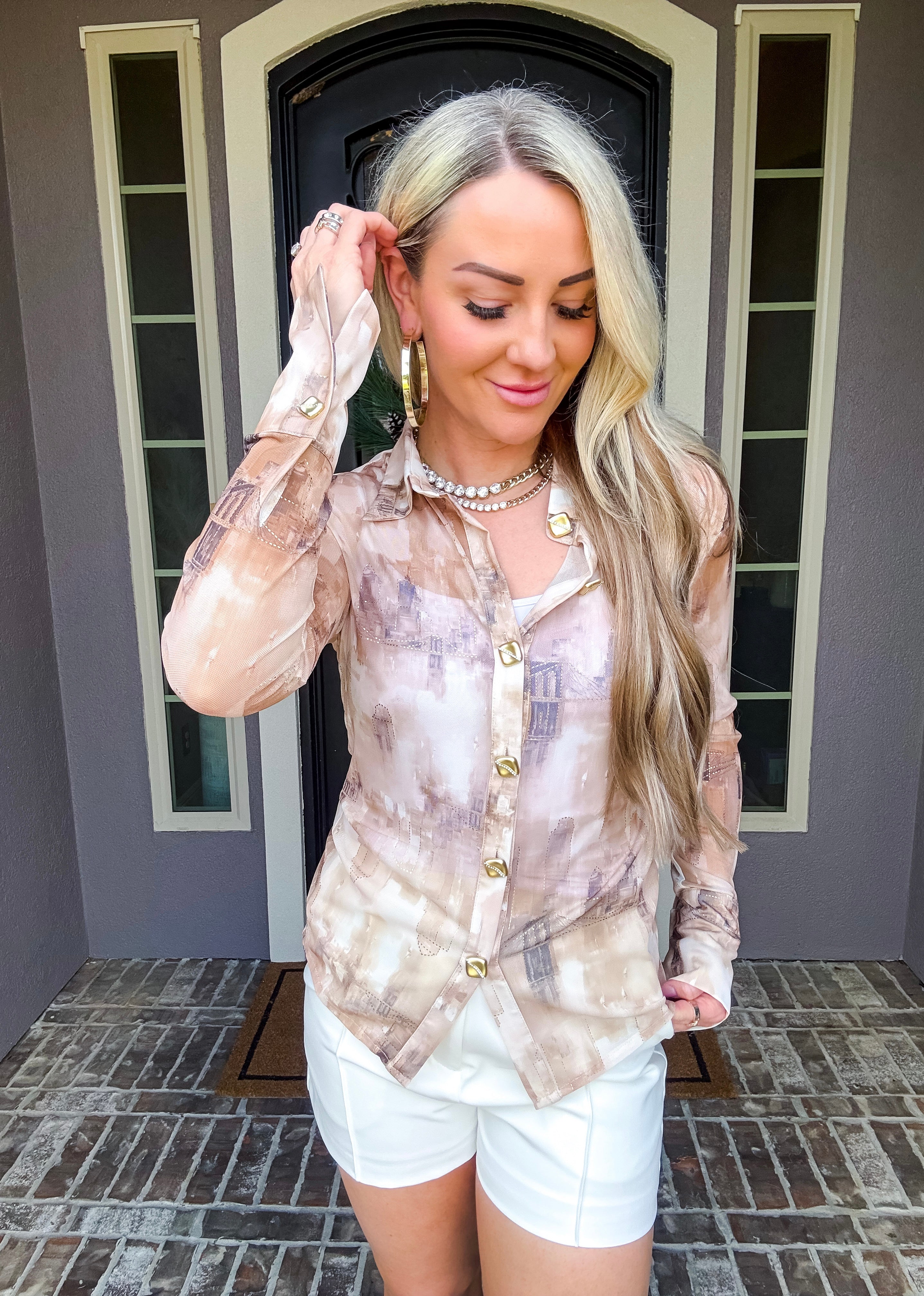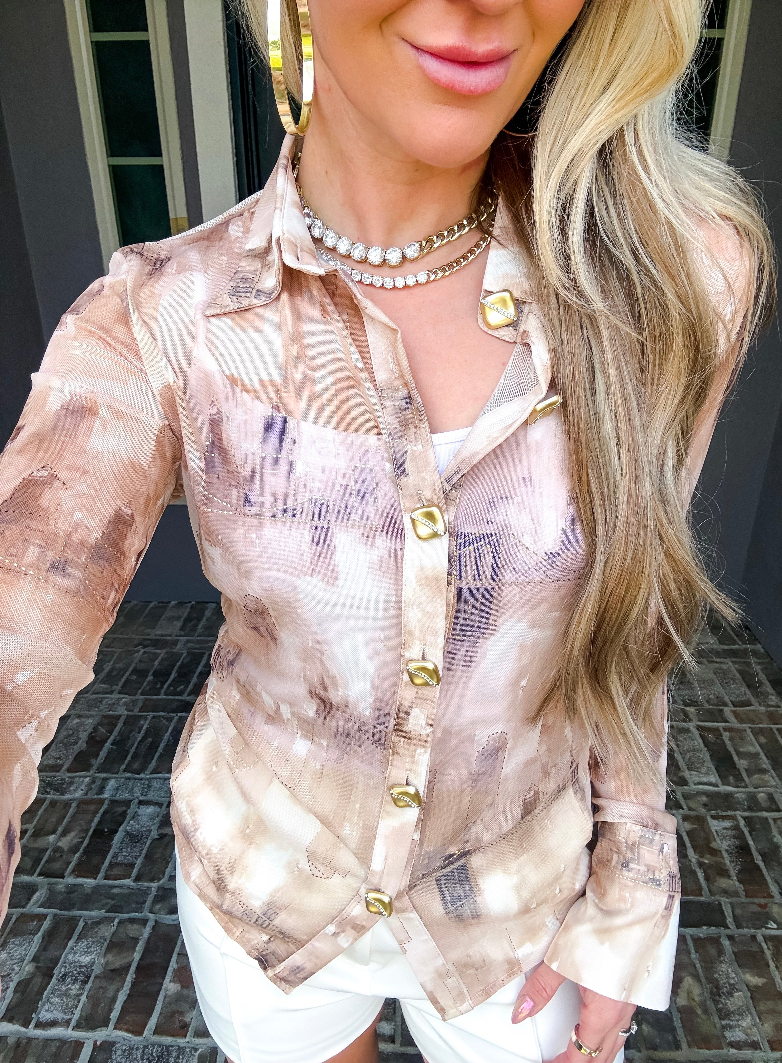 Elevate your wardrobe with this stunning sheer blouse that captures the essence of urban sophistication. Delicate fabric showcases a captivating cityscape design rendered in luxurious gold shimmer, creating an eye-catching statement piece perfect for evening wear or layered styling. The blouse is finished with ornate gold buttons adorned with sparkling jewels, adding an extra touch of glamour and refinement. Each detail speaks to modern elegance, making this piece ideal for those who appreciate architectural beauty and refined accessories. Versatile and distinctive, this sheer blouse pairs beautifully with tailored trousers, skirts, or as a layered piece over a slip dress for maximum impact.